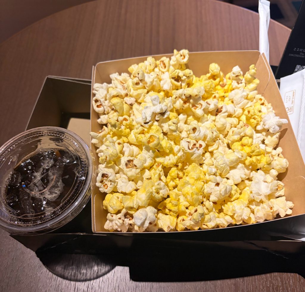 ポップコーンとソフトドリンクがサービスでついてくるので始まるまでポップコーン食べながら待ちます